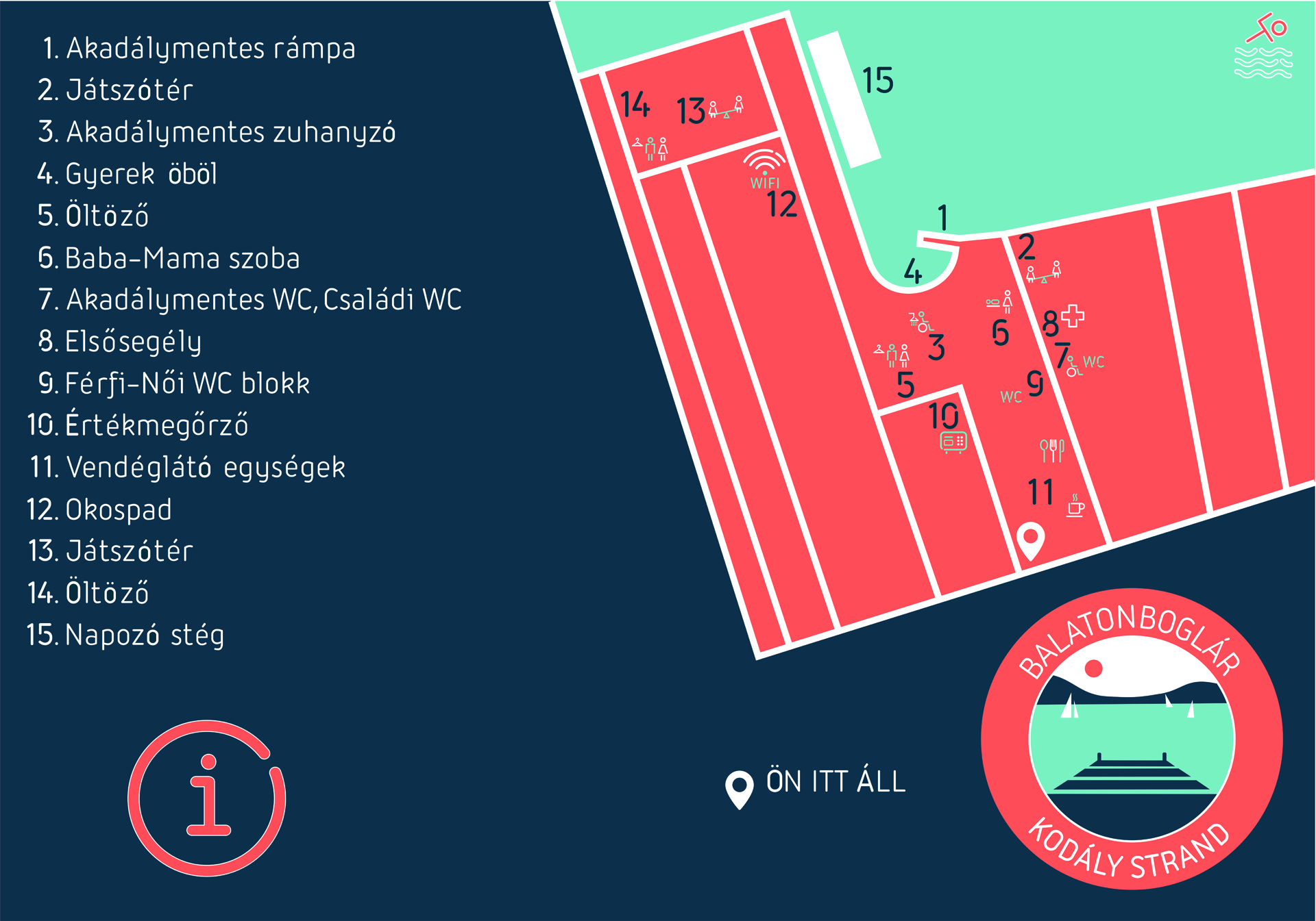 Akadálymentes. szabadtéri zuhanyozó áll rendelkezésre. A strandon kialakított térköves sétány burkolatába taktilis jel került beépítésre.