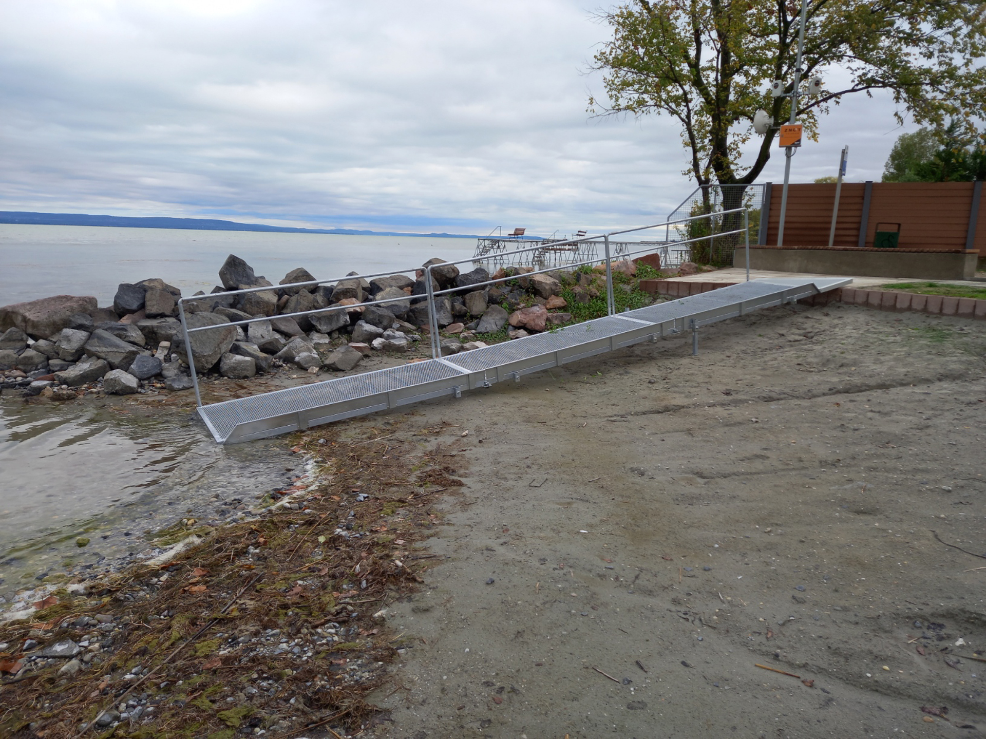 A vízi használatra alkalmas kerekesszékkel való vízbejutás elősegítésére mobil rámpa, vízi kerekesszék áll rendelkezésre.